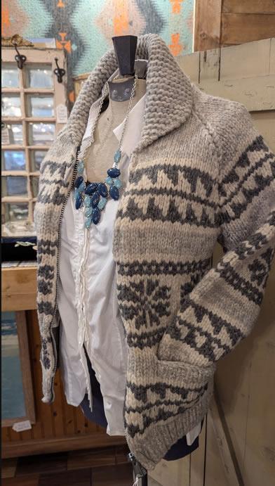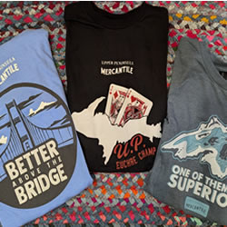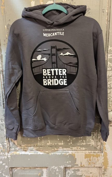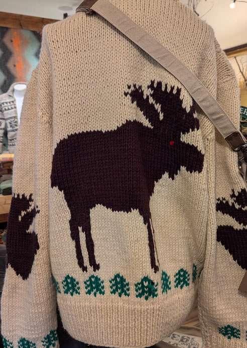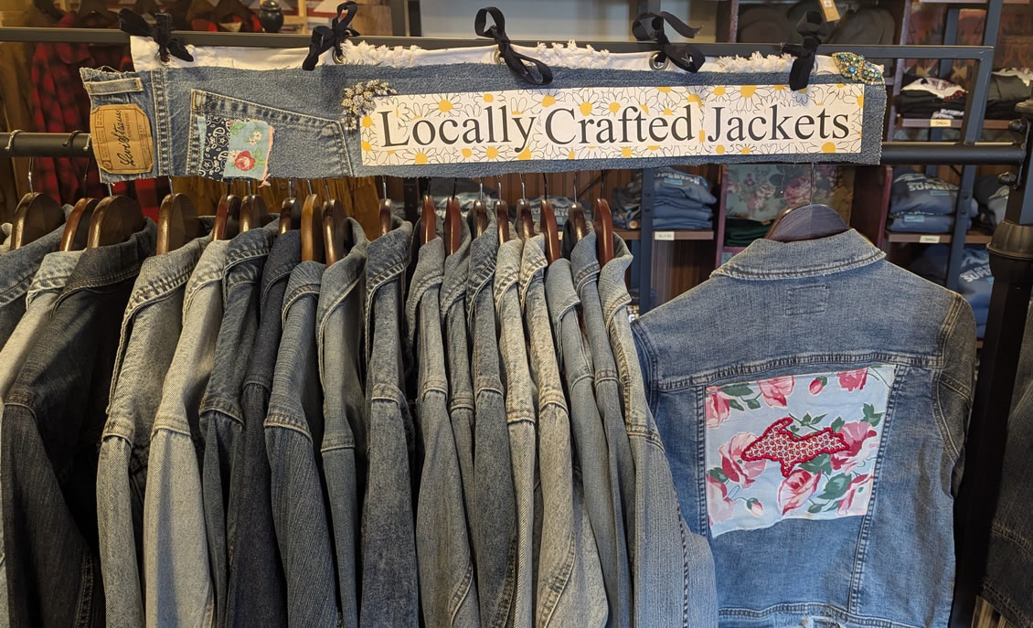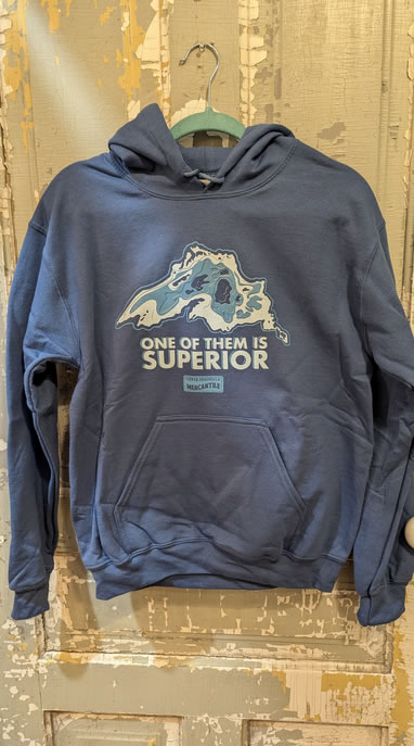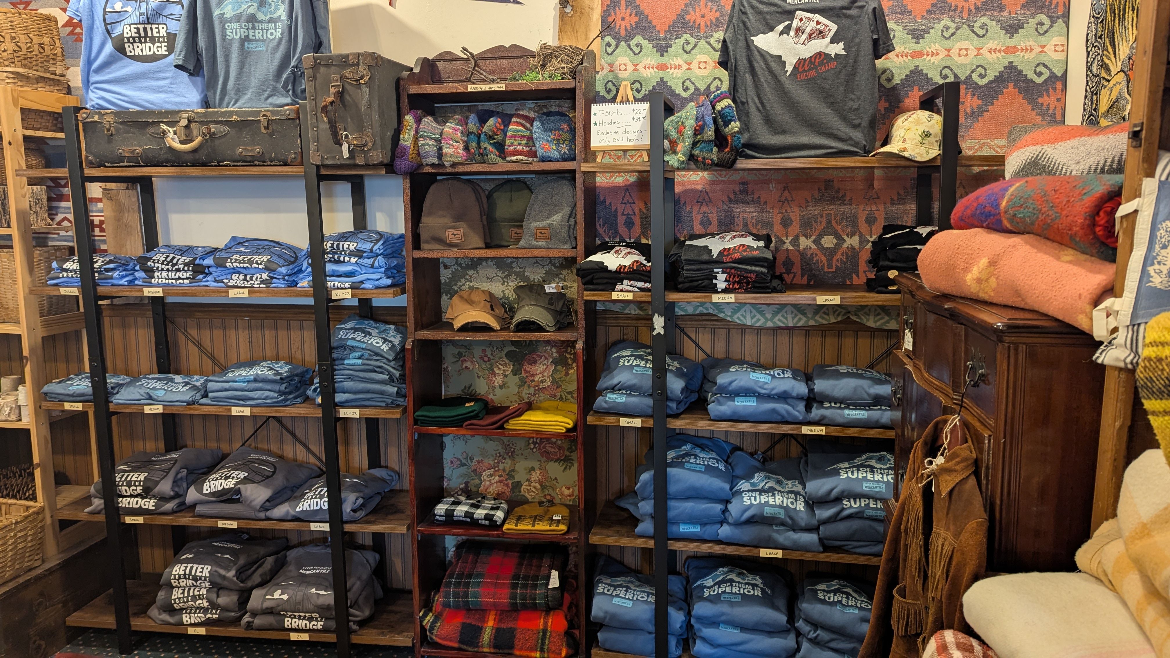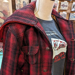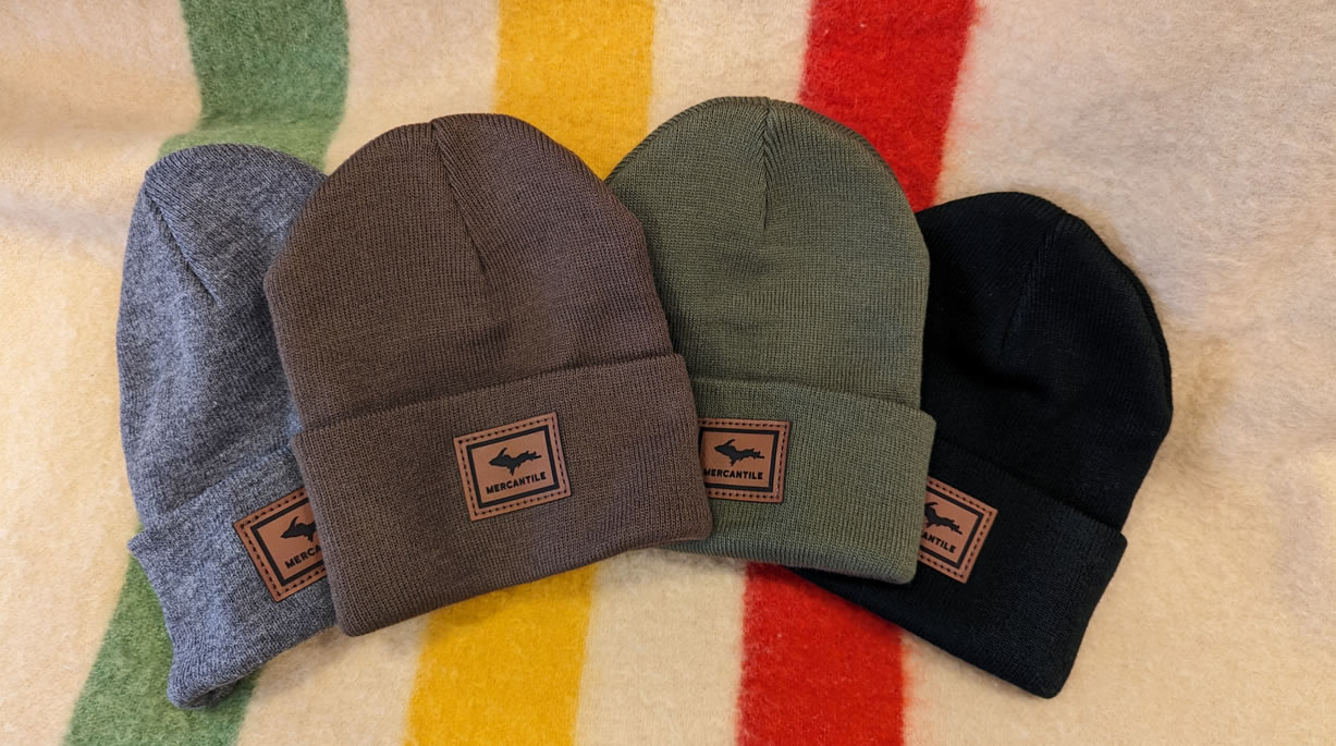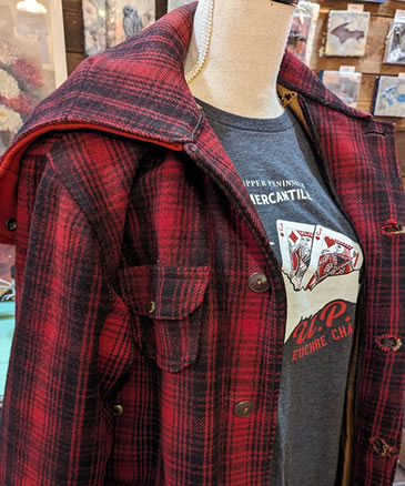 Check out our lineup of exclusive hoodies and T-shirts, our own handmade embellished denim jackets (adorned with our favorite shape -the Upper Peninsula! -or vintage quilt pieces) as well as our ever-changing selection of quality Up North vintage jacketsand sweaters. We feature vintage wool buffalo plaid hunting jackets, vintage hand-knitted wool Cowichan sweaters, and sometimes special lucky finds like buckskin fringe jackets and well-loved leather boots. You’ll be turning heads, Yooper style, in our one-of-a-kind finds! The Mercantile carries caps and hats, plus a range of tote-bags and recycled canvas bags and backpacks.