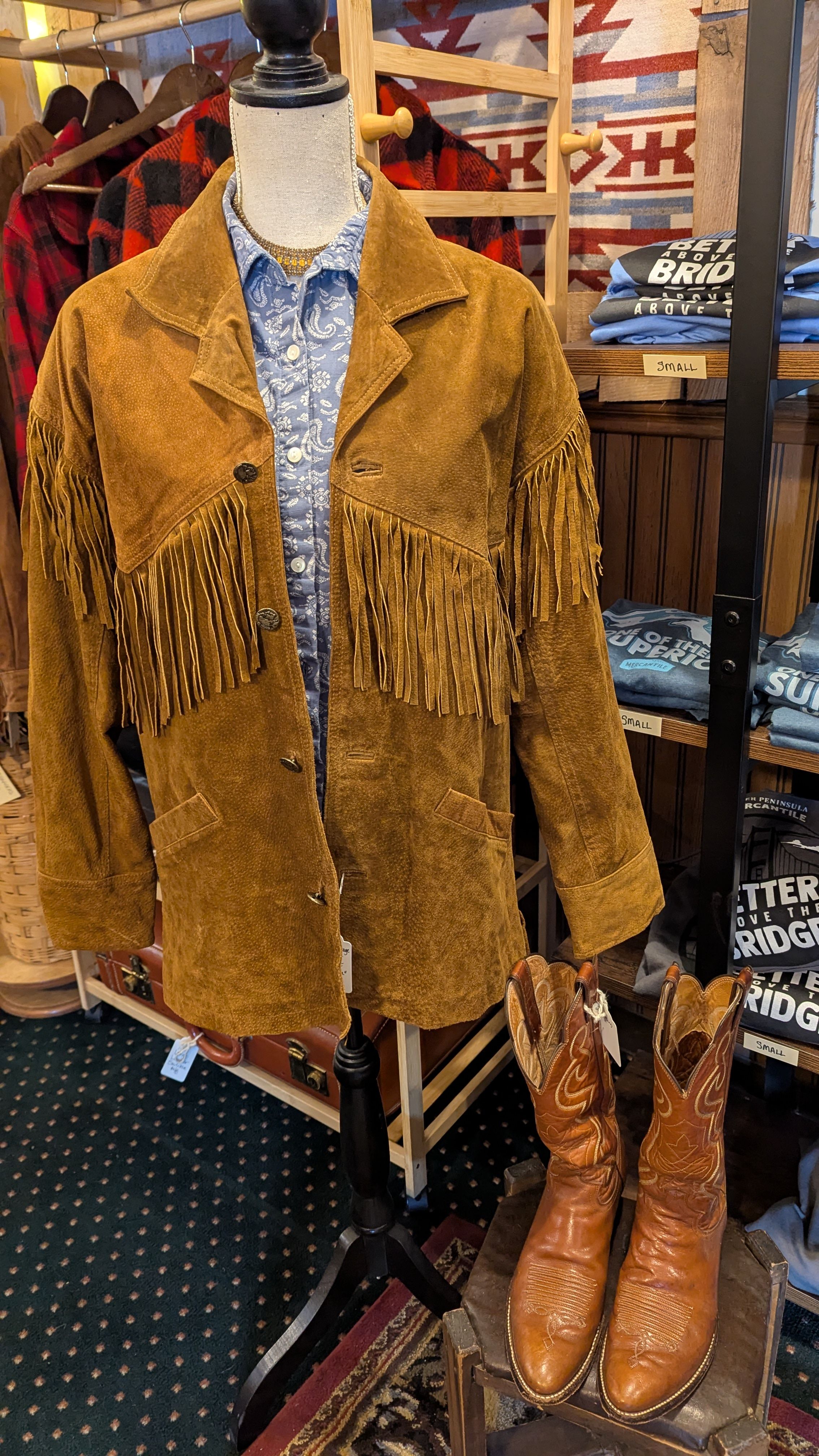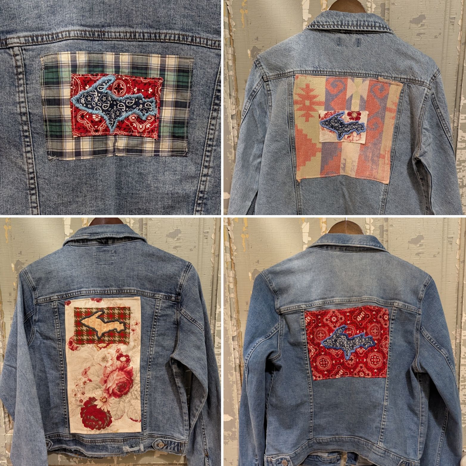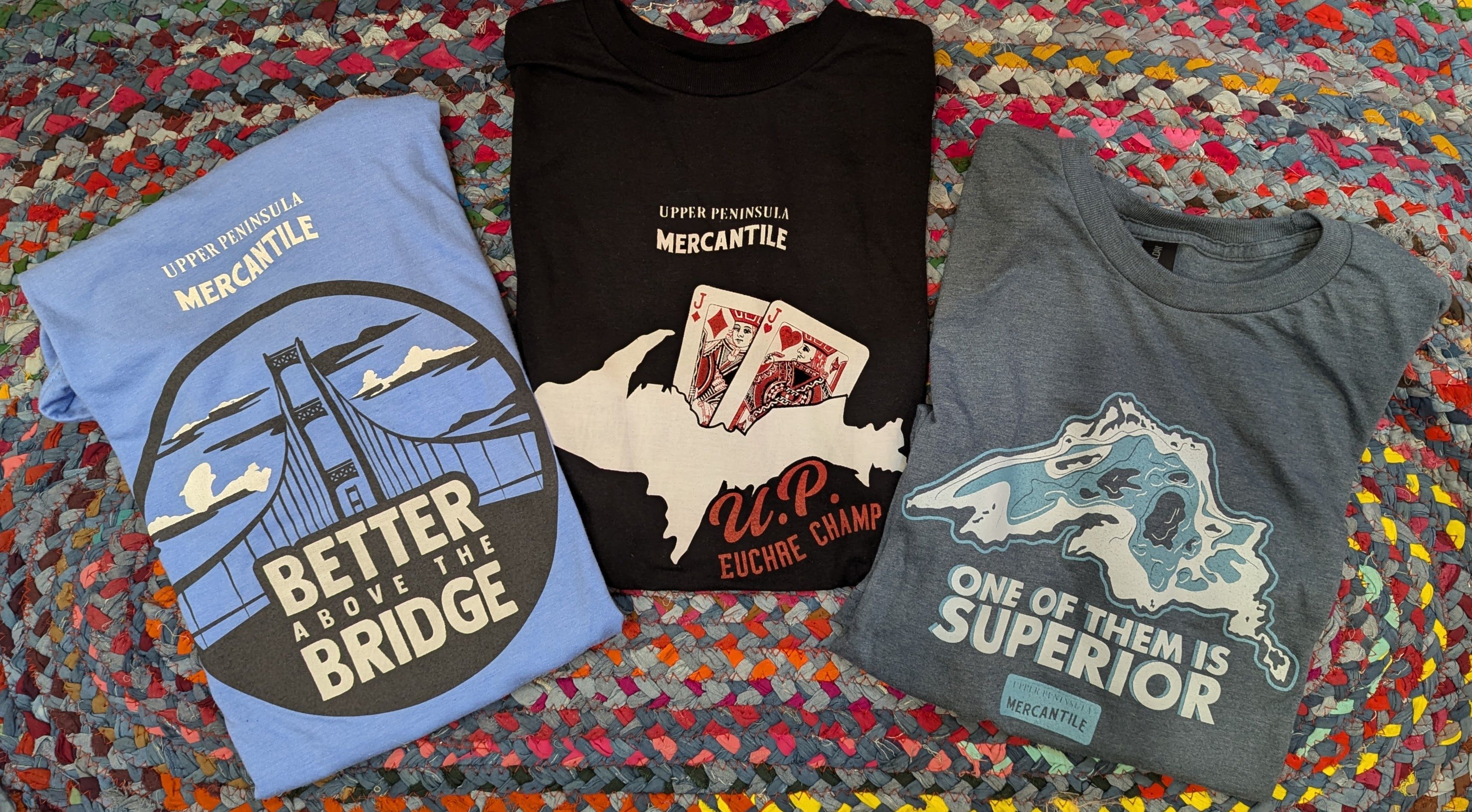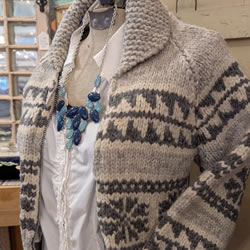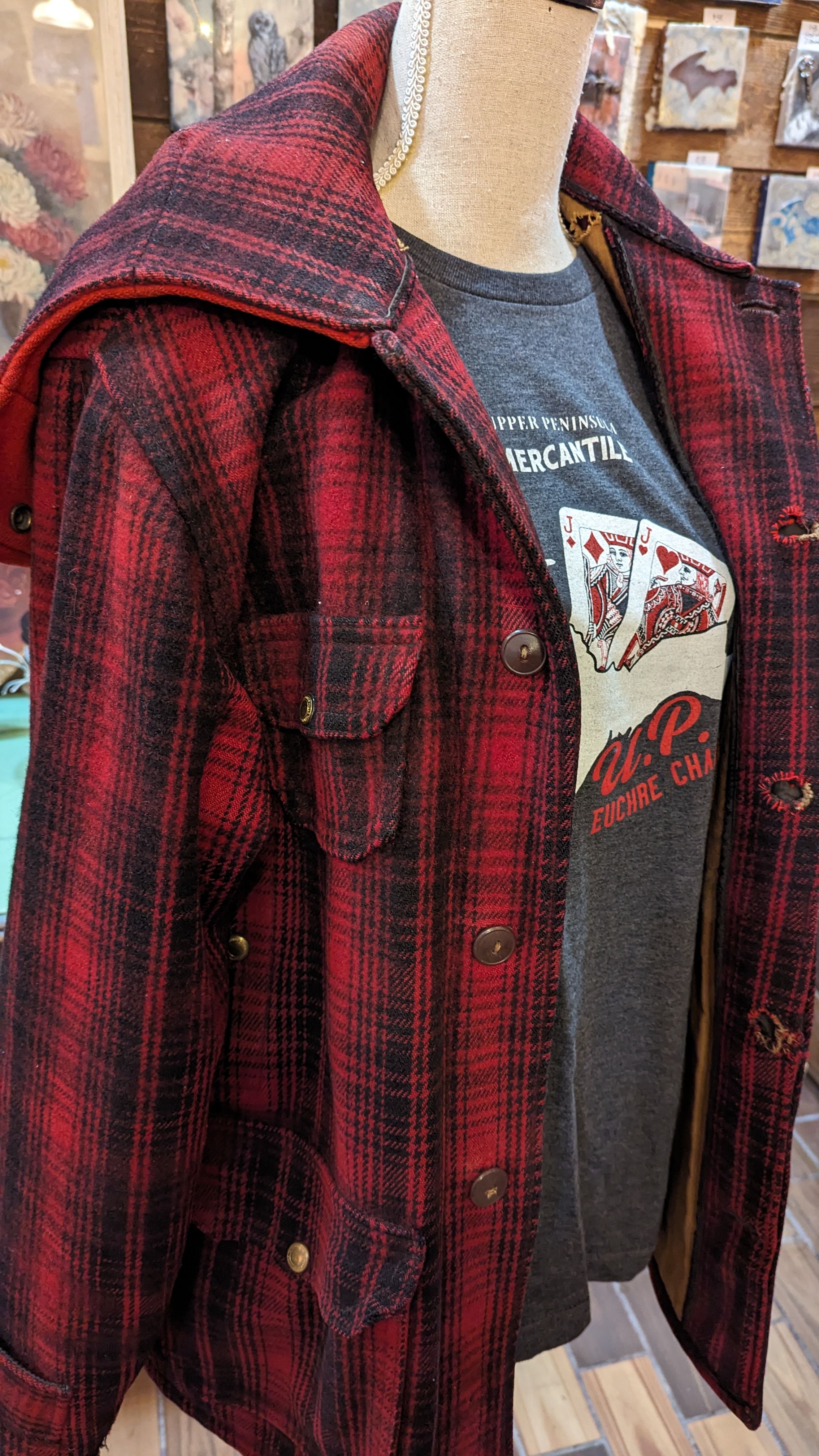 Check out our lineup of exclusive hoodies and T-shirts, our own handmade embellished denim jackets (adorned with our favorite shape -the Upper Peninsula! -or vintage quilt pieces) as well as our ever-changing selection of quality Up North vintage jacketsand sweaters. We feature vintage wool buffalo plaid hunting jackets, vintage hand-knitted wool Cowichan sweaters, and sometimes special lucky finds like buckskin fringe jackets and well-loved leather boots. You’ll be turning heads, Yooper style, in our one-of-a-kind finds! The Mercantile carries caps and hats, plus a range of tote-bags and recycled canvas bags and backpacks.